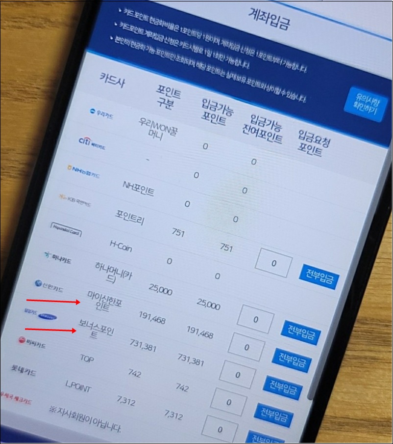 이제는 카드사별로 따로 따로 조회하는 것이 아니라 통합이 되어 한 화면에서 카드포인트 조회 및 입금신청까지 가능합니다.