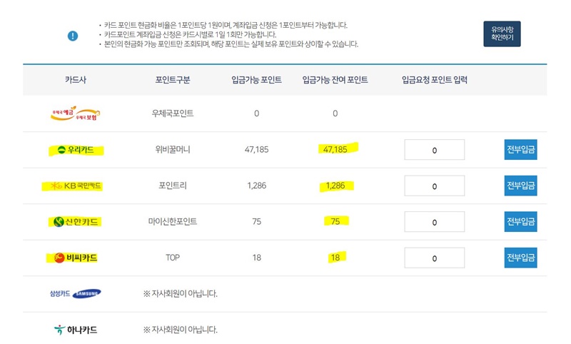 카드가 한개가 아니고 여러개라면 더욱 번거로워 포인트 조회하기 하여 입금요청하는 분들은 많지 않았을 것입니다.