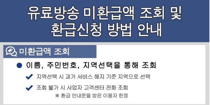 이처럼 유료방송 미환급금 조회 서비스는 유료방송 서비스 이용자들의 권익보호를 위해서 유료방송 서비스의 가입, 해지 과정에서 충분히 발생할 수 있는 미환급액 정보를 온라인상으로 실시간 조회를 할 수 있고 환급까지 신청할 수 있는 대국민 공익서비스 입니다.