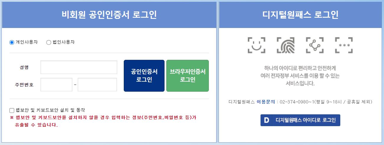 본인의 이름과 주민번호를 입력하고 공인인증서 로그인을 해줍니다.